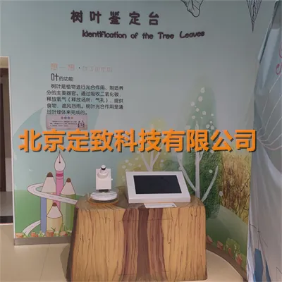 展项设计一个树桩造型的操作台,台面上安装一台显示器,无人参与时,显示器画面循环播放植物树叶的形态特征以及主要作用。操作台中间设置一个圆形转盘,转盘上方设置一台检测装置,转盘盘面上设有多种树叶的叶片图片。观众通过转动转盘选取某一片叶片让它转至检测装置下方,通过检测后触发显示器播放该植物叶片信息的相关内容知识介绍。